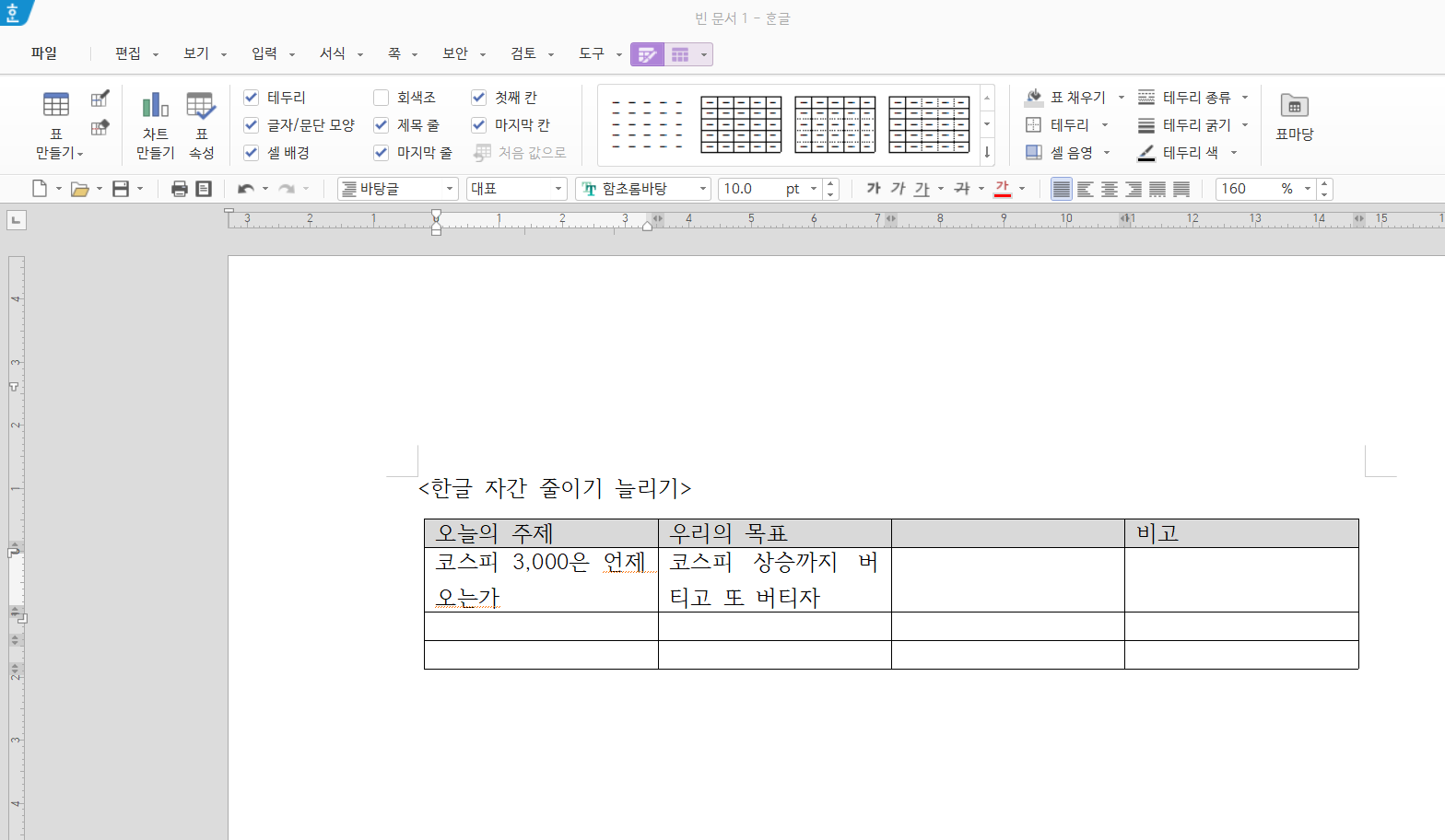 표안에 데이터를 입력했지만 깔끔해보이지 않죠? "코스피 3,000은 언제 오는가"를 한 문장으로 만들어볼거에요.